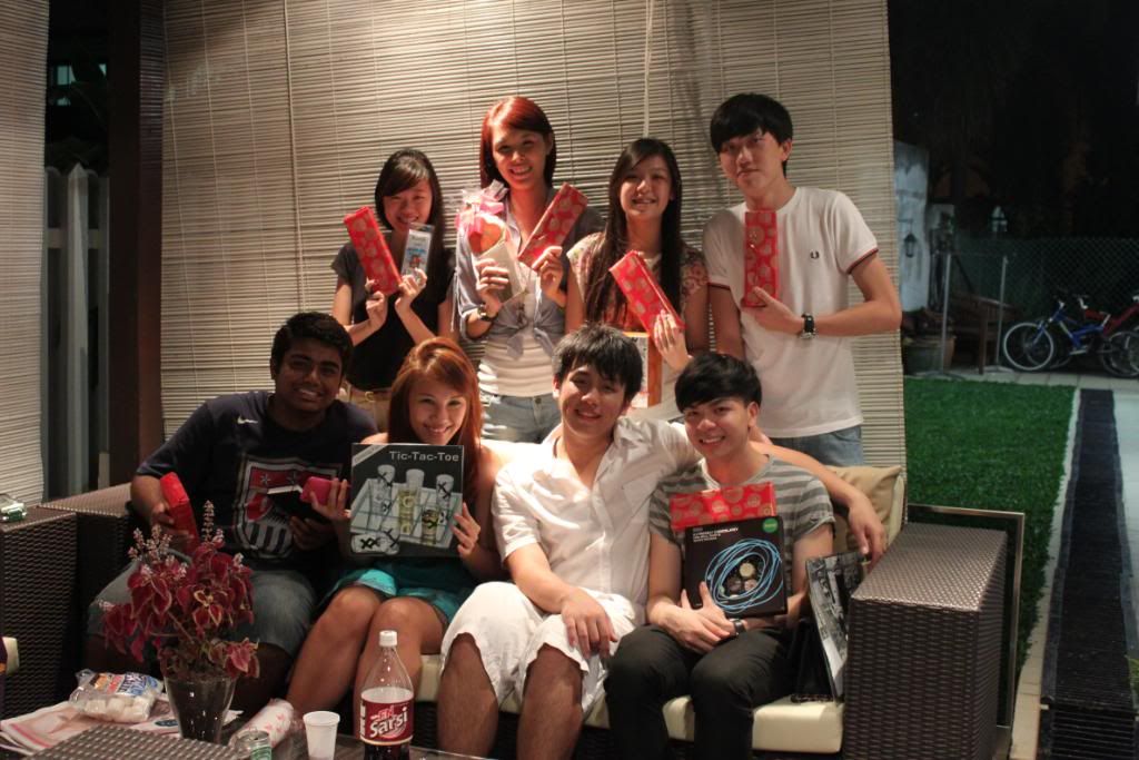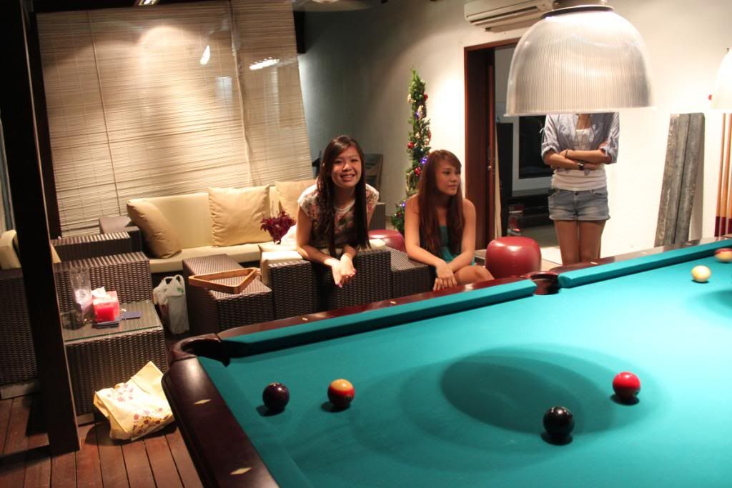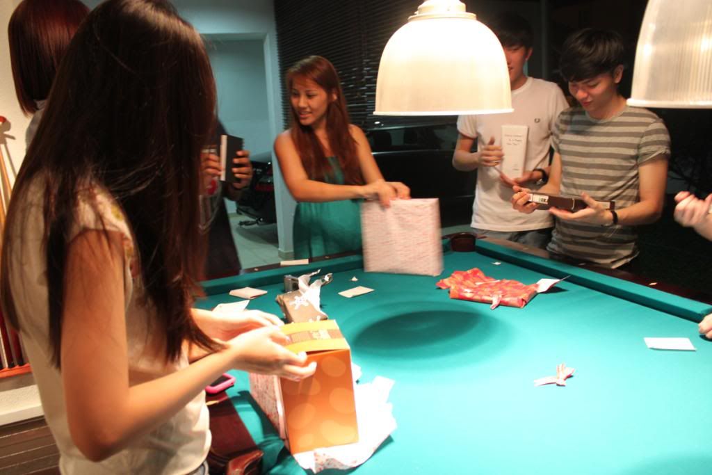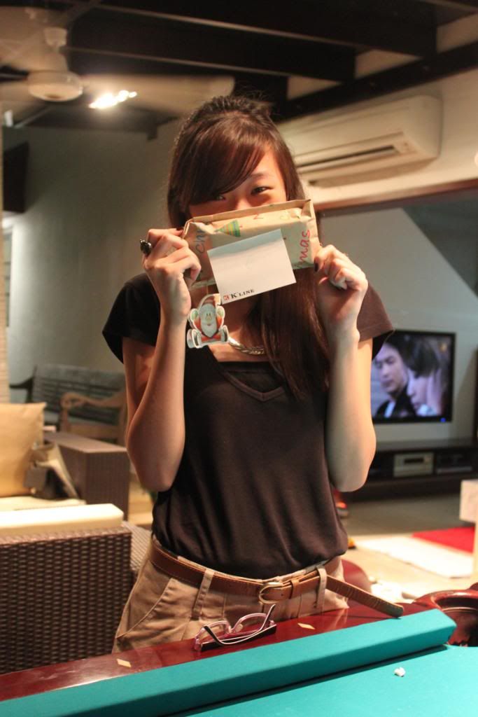 Xmas party #2 @ Jereld's shiok place last night was one of the best nights with them :> His place is finally done renovating and the very nice him invited us over to his place for xmas gift exchange party! His place is 4 storeys high, with his first and last level being the most awesome place to chill.... Ahhh envy. First level, there is the bbq grill and poool table! Last level, BAR!!!!! Woah totally shiok life.